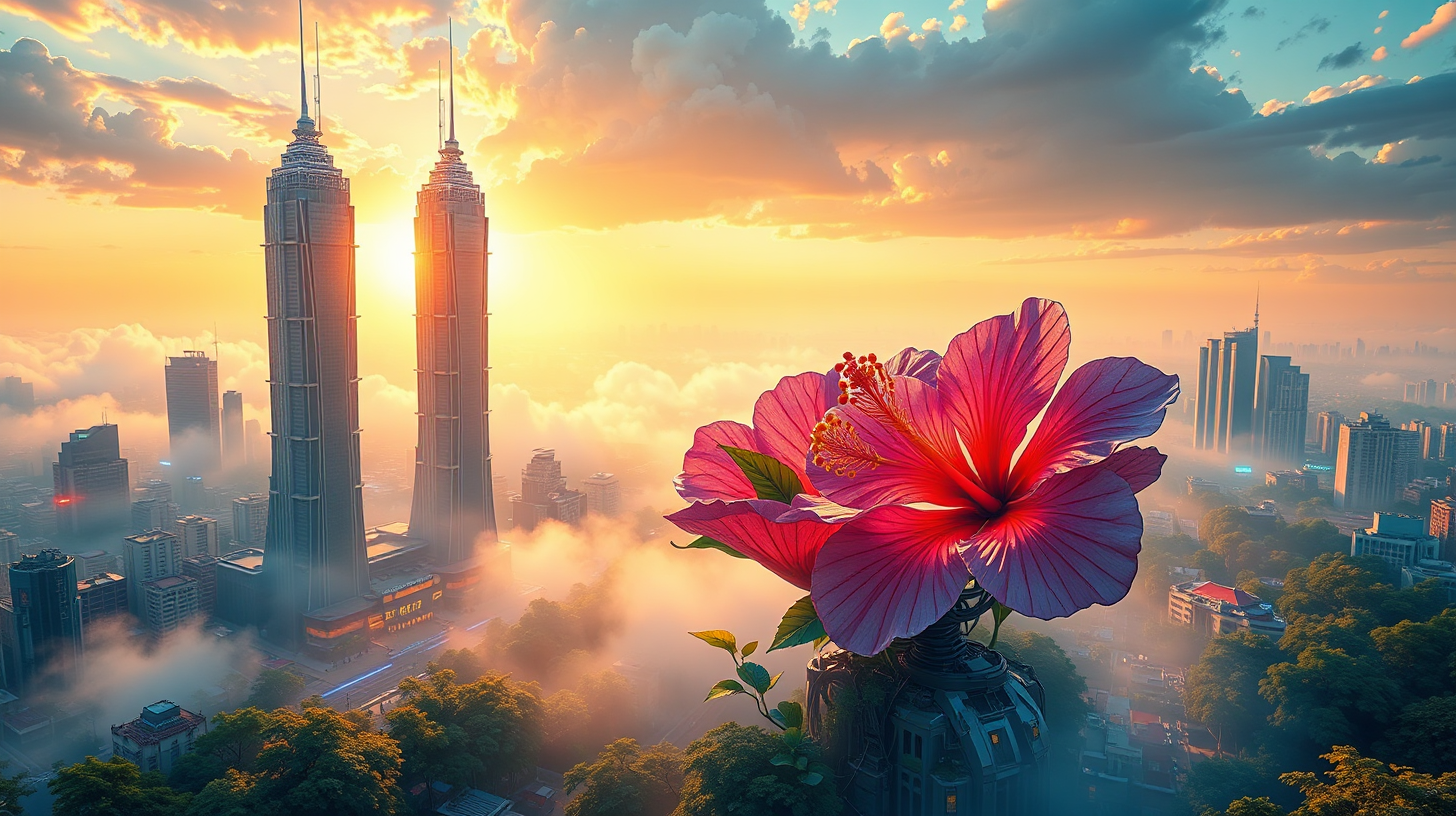 作图提示词:An aerial view of the Twin Towers reimagined as an elegant mechanical hibiscus emerging from the urban landscape, enveloped in warm morning mist as sunlight filters through the petals. This design subtly integrates futuristic elements of the Kuanzhai Alley below, symbolizing the ongoing development and innovation in Chengdu. The scene is rendered in vibrant colors and bright ambient lighting, emanating a sense of hope and vitality.