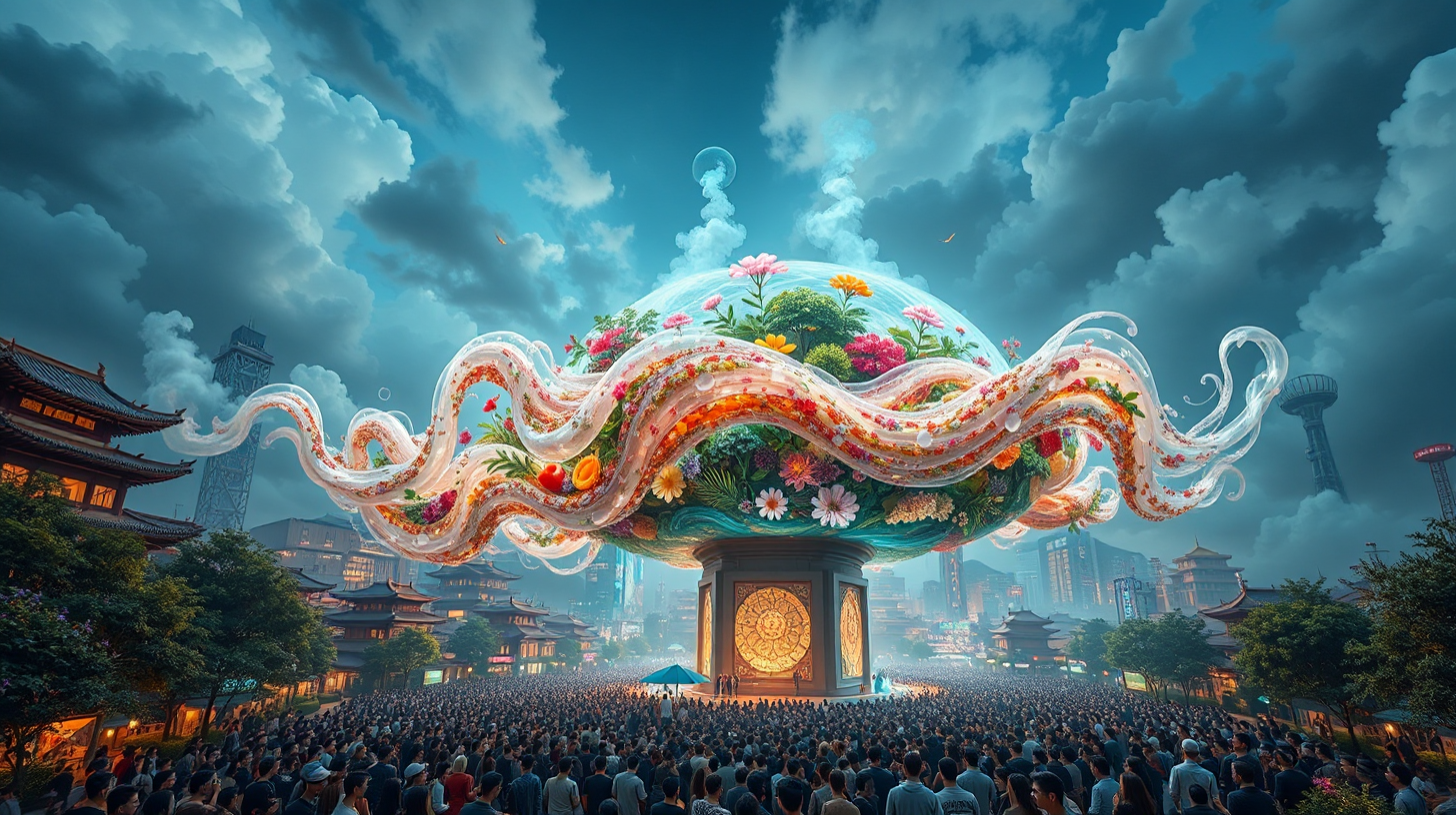 作图提示词:An ecological simulator hovering above Taikooli, gracefully emitting waves of diverse aromas that fluctuate visually, representing Chengdu’s rich cultural tapestry. A bird’s-eye view captures the intrigued crowd below, gazing upwards at this groundbreaking installation, blending modern innovation with cultural storytelling.