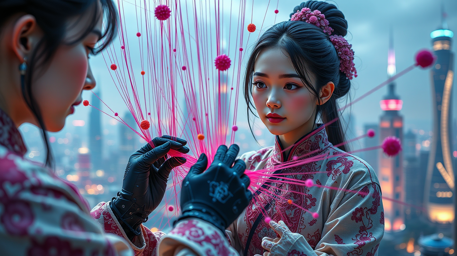 作图提示词:A close-up shot of skilled Shu embroidery artisans wearing neural-linked gloves, intricately weaving quantum brocade in the air, with vibrant threads suspended around them. Their focused expressions reflect artistic concentration, capturing a moment of creative unity against a stunning backdrop of Chengdu’s futuristic skyline. The scene is illuminated by soft ambient lighting, showcasing a blend of traditional craftsmanship and advanced technology in a harmonious atmosphere.