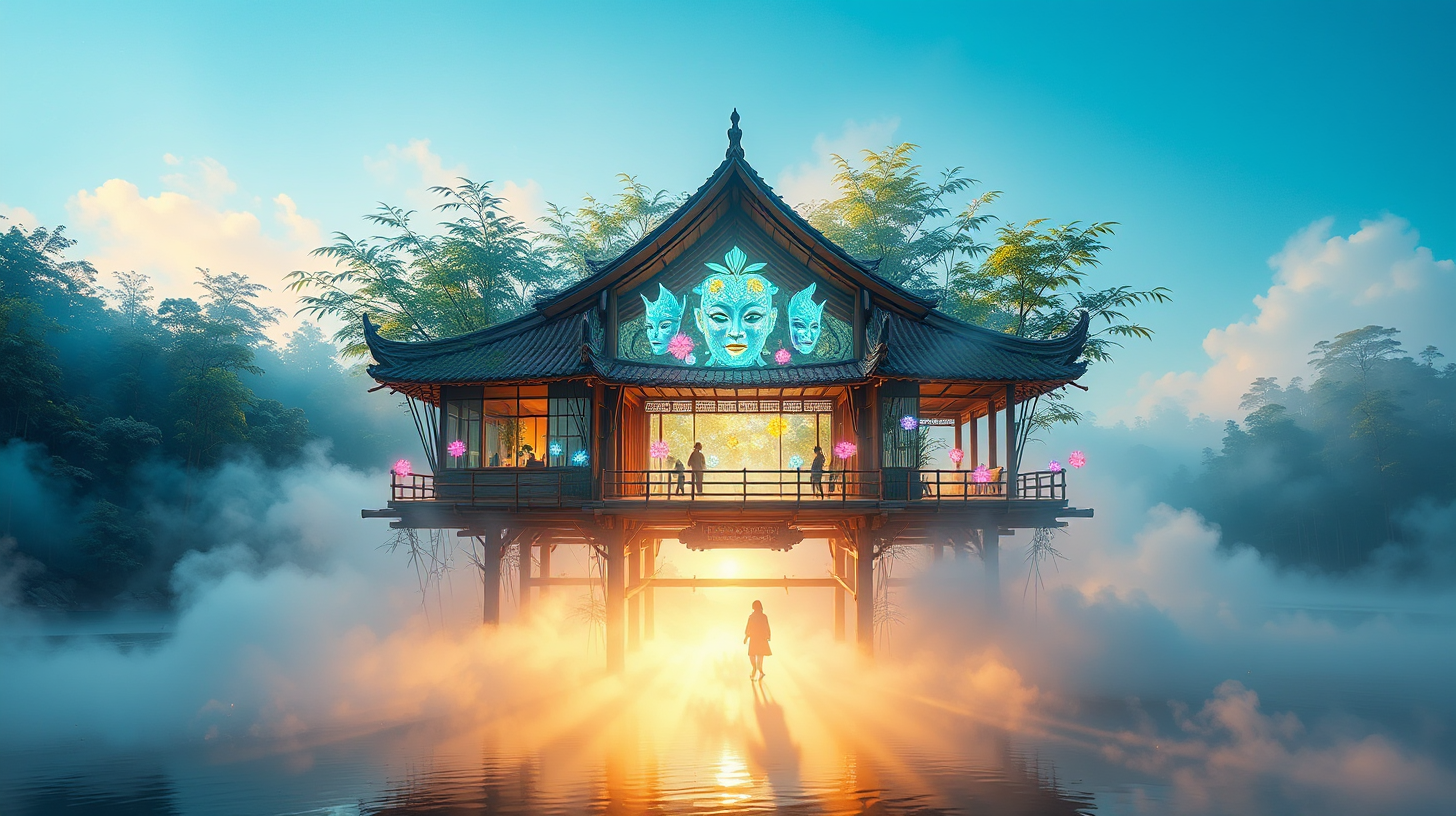 作图提示词:A breathtaking floating bamboo tea house by the Jinjiang River, shrouded in a mystical quantum mist, with holographic Sichuan opera masks seamlessly intertwining within the fog, constructed from transparent materials that vividly mirror the blue sky and the verdant bamboo forest, warm soft light gently piercing through the mist, casting colorful shadows below; an aerial view focusing on the dynamic suspended holograms, creating a serene yet enigmatic atmosphere.