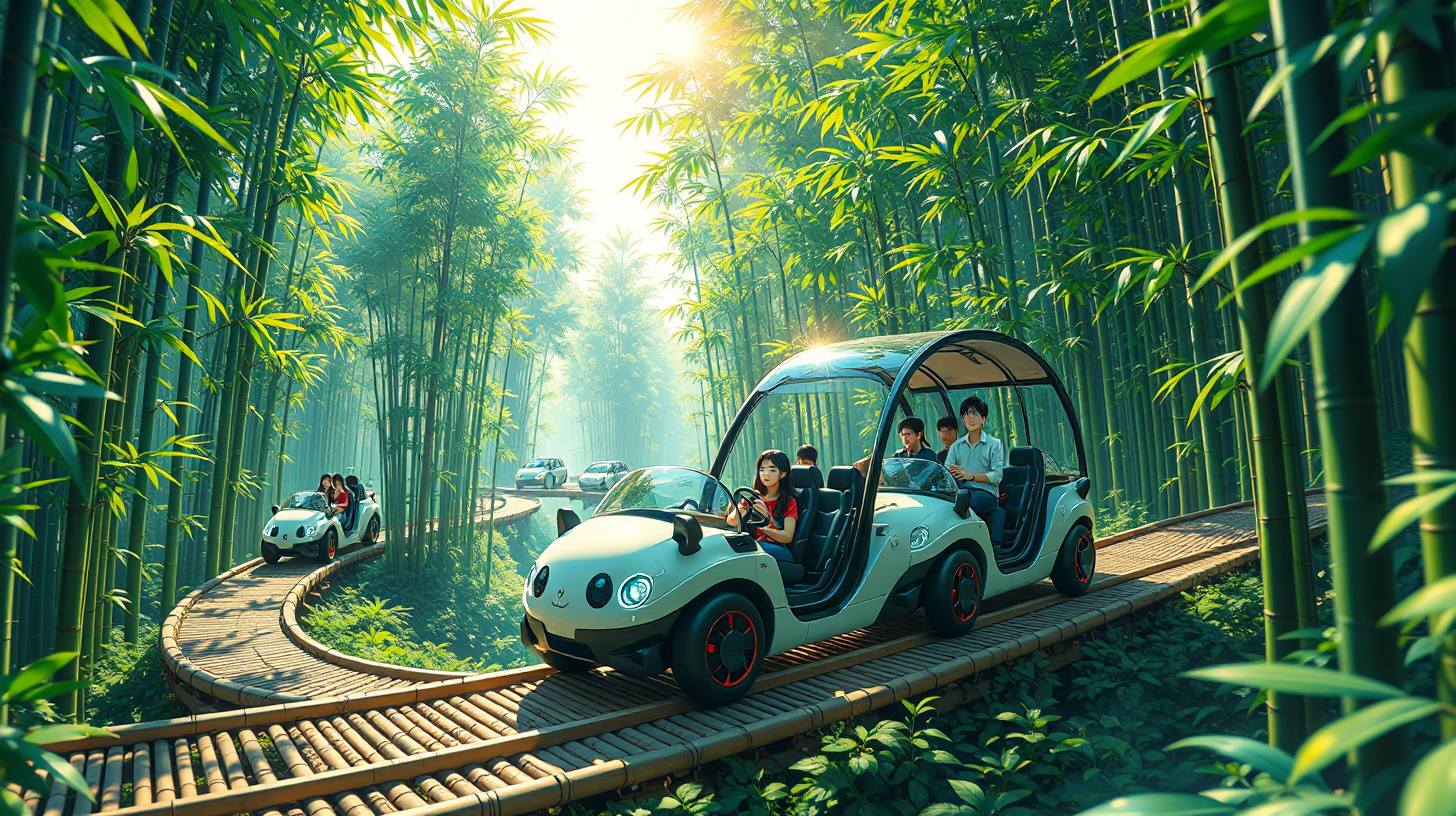 作图提示词:A winding bamboo fiber track meandering through a lush bamboo forest, where photon-powered panda cars glide effortlessly, sunlight streaming through the vibrant green leaves, creating bright reflections on the vehicles; a wide-angle view showcasing the joyful citizens embracing these innovative transports, highlighting the seamless harmony between technology and nature.