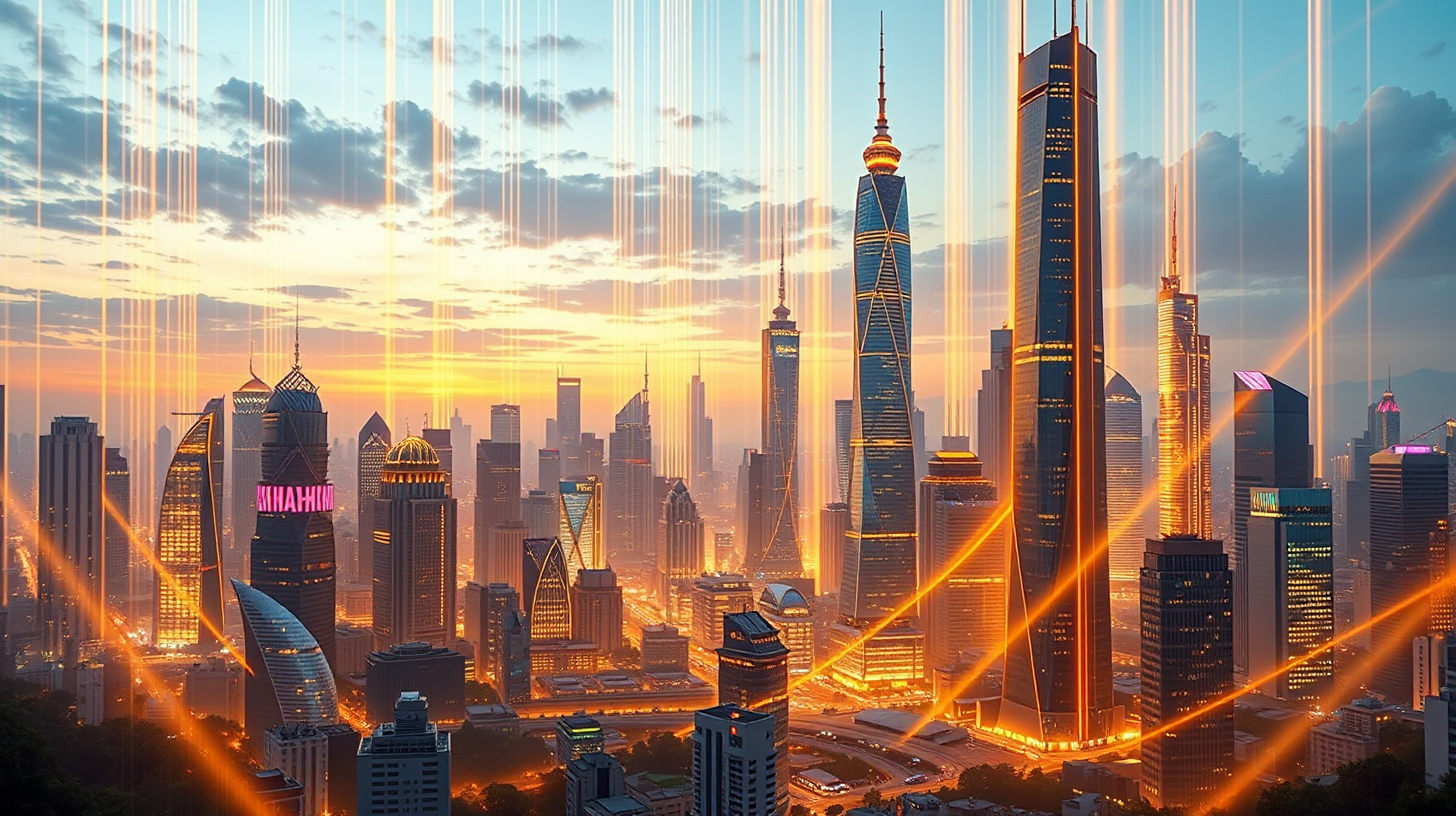 作图提示词:A breathtaking view of futuristic skyscrapers in Shanghai at dusk, illuminated by cascading golden light that enhances the skyline’s magnificence. Streams of light flow through the urban environment, creating a dynamic pulse of technology as skyscrapers tower above.