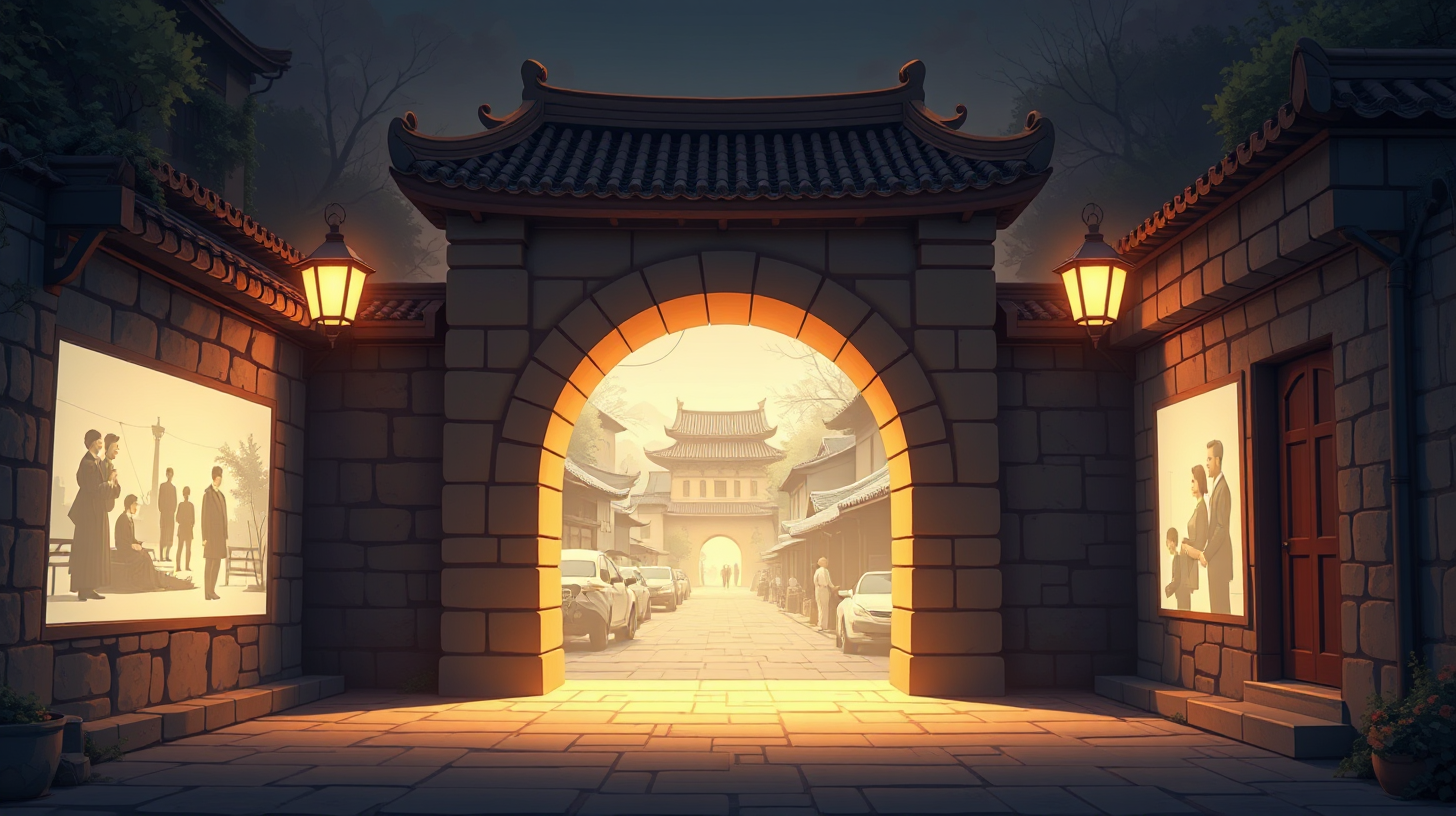 作图提示词:A warm, inviting scene of a traditional stone gate alley illuminated by soft, ambient lights showcasing holographic scenes from history, creating a harmonious blend of nostalgia and future aspirations. The medium shot captures the essence of history meeting modernity in a serene atmosphere.