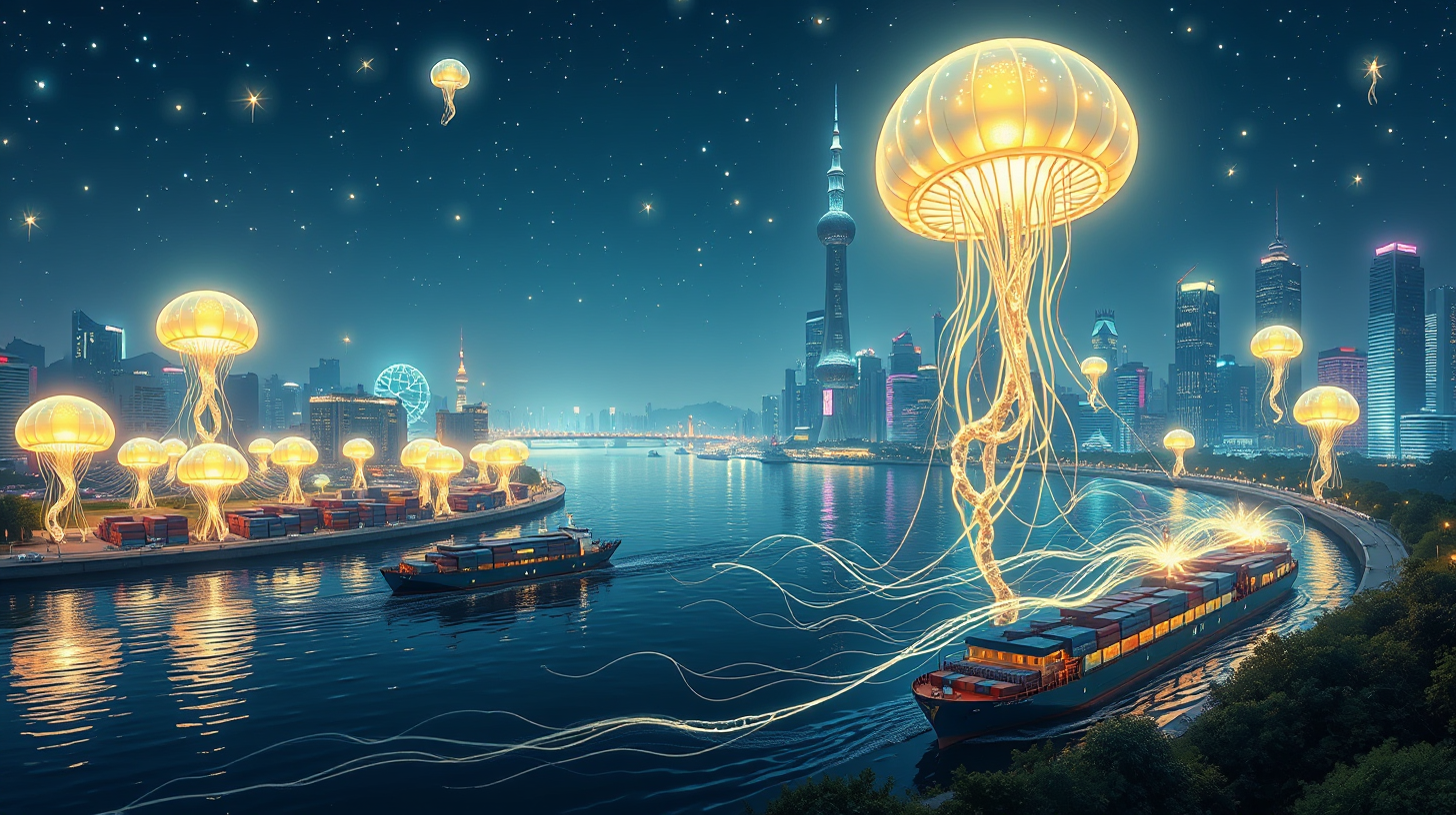 作图提示词:An enchanting night scene along the Huangpu River where glowing jellyfish-like machines sparkle like stars. The illuminated cityscape juxtaposes with the tranquil river, creating a stunning tableau of futuristic logistics, with flowing light trails from vessels enhancing the visual drama.