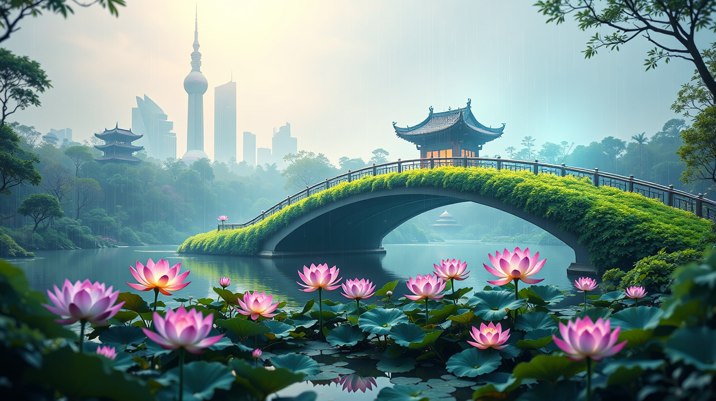 作图提示词:A vibrant quantum moss-covered bridge over a serene lake in a futuristic traditional garden of Shanghai, gently illuminated by soft ambient light amidst light rain. Holographic lotus flowers bloom radiantly, their colors shifting with the emotional ambiance, enhancing the harmony of technology and nature.