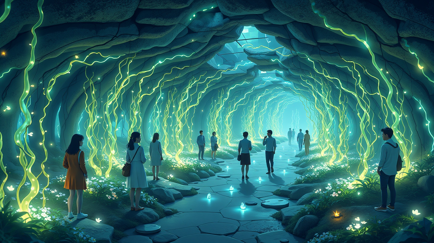 作图提示词:A panoramic view of the underground neural garden at Hongqiao Hub, featuring bioluminescent vines shimmering softly. As residents and travelers interact with the vines, threads of light symbolize their shared memories, creating a dream-like ambiance accentuated by mystical lighting casting gentle shadows, showcasing a strong emotional connection among individuals.