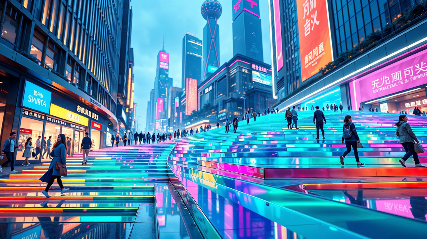 作图提示词:A close-up view of a bustling street in futuristic Shanghai, showcasing smooth, programmable glass steps reflecting vibrant colors as pedestrians move. The scene highlights dynamic visuals and innovative architectural elements, illuminated by ambient lighting that creates a lively yet serene atmosphere.