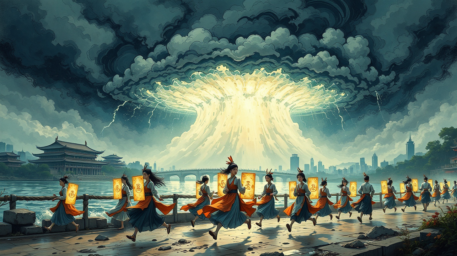 作图提示词:A dramatic scene depicting an approaching storm with citizens running in urgency, wearing modern interpretations of traditional Suzhou attire that blends cultural elements with futuristic designs, plasma shields shimmering above the river, under dark, swirling clouds, captured in a medium shot that conveys the energy and tension of the moment.