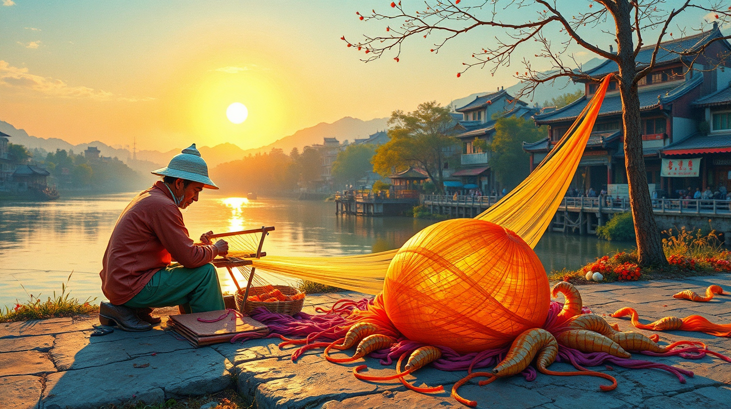 作图提示词:A vibrant scene on Pingjiang Road, where a silk craftsman, entirely focused, skillfully weaves silk using traditional methods. The sun rises, casting golden light on a beautifully crafted silk cocoon placed by the riverside. Smartly designed silkworms nearby create vibrant silk threads, weaving a dreamlike tapestry. Captured from a slightly elevated angle, the bright colors and energetic mood reflect the harmony of tradition and innovation.