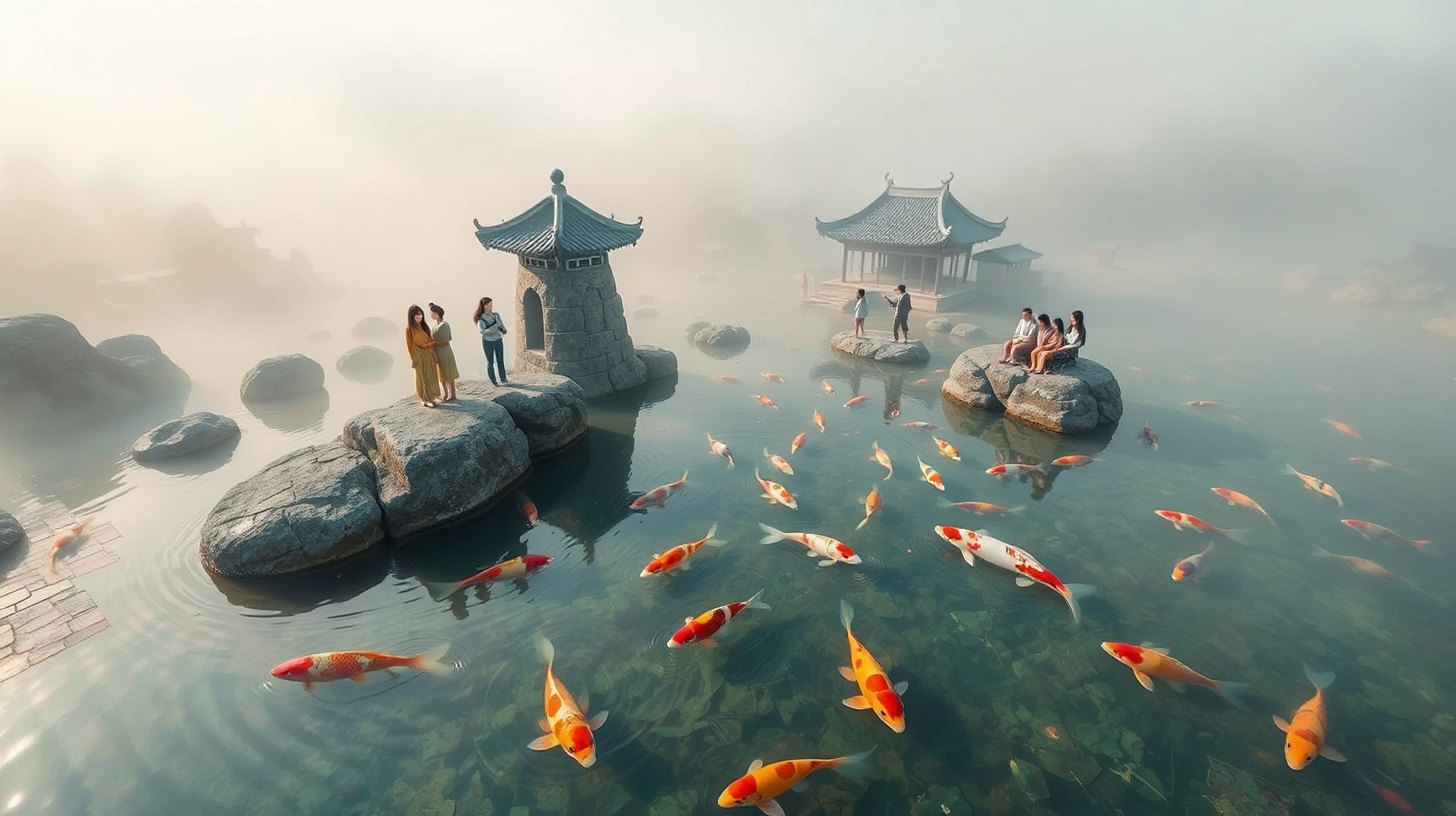 作图提示词:A serene morning in Suzhou’s Zhuozheng Garden, with thick mist swirling around picturesque Taihu stones. In crystal-clear water, colorful koi swim gracefully, while tourists with expressions of wonder gently touch the water’s surface, creating ripples that unveil the ancient garden’s beauty. Captured from a bird’s-eye view, the soft ambient light enhances vibrant colors, creating a calm and mesmerizing atmosphere.