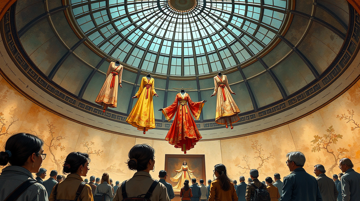 作图提示词:Under the majestic dome of the Kunqu Museum, exquisite traditional costumes hang gracefully as if in a dance, reflecting the rich cultural heritage. Citizens express awe and deep emotion as they admire the craftsmanship, depicted in a close-up view. The heartfelt and profound mood captures the essence of this historical connection.