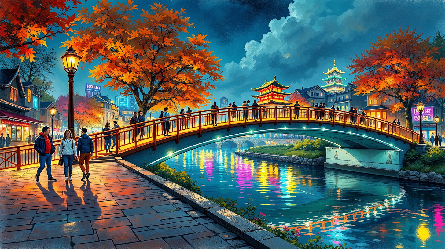 作图提示词:A lively scene at Maple Bridge, featuring a beautifully illuminated pedestrian bridge with colorful lights reflecting in the river below. Footsteps resonate as passersby enjoy the atmosphere, captured from a frontal view. The lively ambiance and vibrant colors evoke feelings of joy and excitement, perfectly blending tradition with modern life.