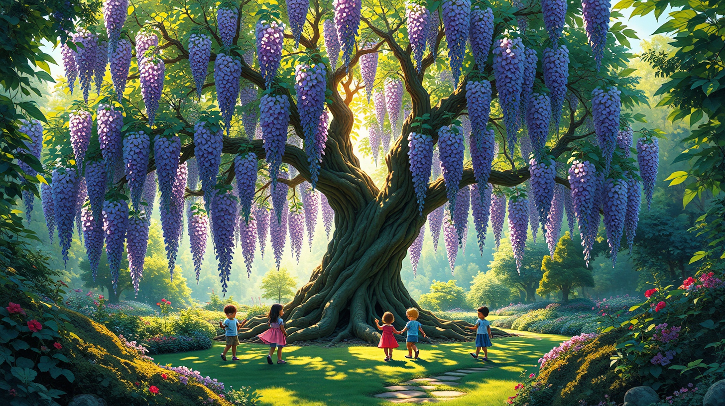 作图提示词:A beautiful ancient wisteria tree surrounded by curious children interacting playfully, with soft sunlight filtering through the leaves, rich greens and purples creating a vibrant and serene atmosphere, captured in a wide shot that emphasizes the tranquility of the garden.
