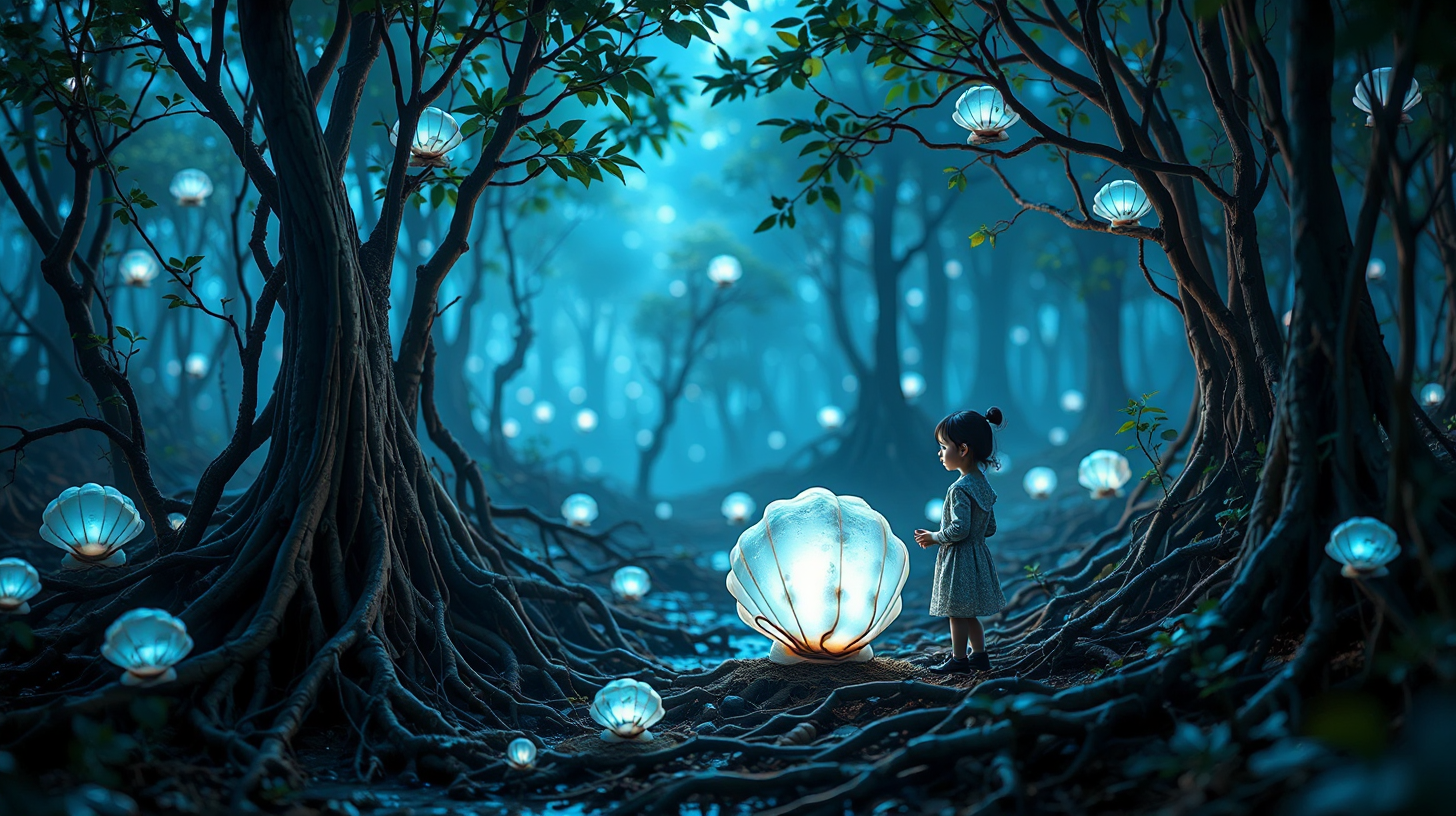 作图提示词:A vivid tidal wisdom forest in Fangchenggang, where the roots of mangroves intertwine seamlessly with innovative sea shell-like neural interfaces that activate tidal energy pulses. A young girl attentively harnesses this energy, creating a connection with nature. Captured from a side view, the scene is illuminated by soft blue light, evoking a calm and mysterious ambiance.