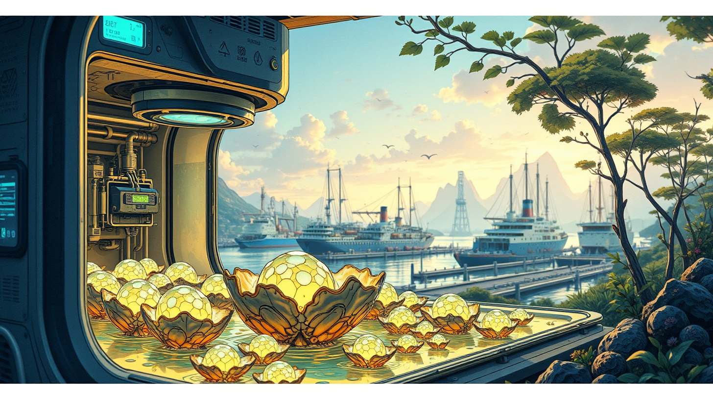 描述:珍珠湾上的零重力创客舱内,生物打印机散发着柔和的光芒,正精心培育着发光的量子牡蛎。这些牡蛎在微光中轻轻摇曳,仿佛一个个灵动的生命音符。背景中,未来感十足的货轮静静停靠在量子港口,与周围的自然景观巧妙融合,生物ophilic设计元素随处可见。创客们专注地忙碌着,轻微的机器运转声与低语声交织,营造出充满探索与创造的氛围,展现出科技与自然共生的无限可能。