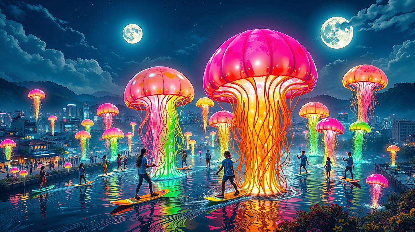 作图提示词:Under a bright full moon in Fangchenggang, the city is illuminated by a luminous energy system. Youths on magnetic surfboards are creating vibrant pulse totems while luminous jellyfish interact with their movements. The scene is captured from an aerial viewpoint, bursting with bright colors, depicting a dynamic atmosphere filled with energy and enthusiasm.