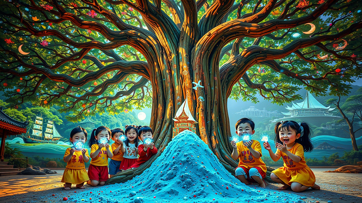 作图提示词:Under a millennium-old banyan tree in Fangchenggang, children joyfully hold quantum sea sand and infuse it into the tree’s trunk, symbolizing a fusion of tradition and technology. Holographic projections of the Maritime Silk Road illuminate the scene. The perspective is frontal, featuring bright colors and a warm atmosphere filled with excitement and joy on the children’s faces.