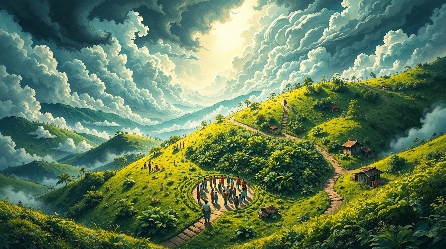 作图提示词:An aerial view of residents gathered in a lush green valley, working together to construct a natural barrier against an approaching typhoon, symbolizing unity with nature. The scene is charged with energy, as swirling clouds form a dramatic backdrop, while bright natural light breaks through, illuminating their teamwork and determination, reinforcing hope amidst the impending storm.