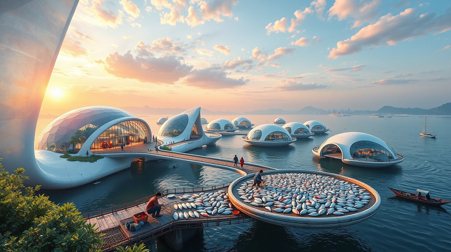 作图提示词:A futuristic quantum dock in Guangxi’s Fangchenggang during dawn, showcasing flowing curves of the structure with magnetic levitation corridors connecting ecological domes to the ocean. Fishermen sorting fish on a platform, symbolizing harmony between humans and nature. The scene is captured from an aerial perspective, emphasizing vibrant colors, soft lighting, and an energetic atmosphere.