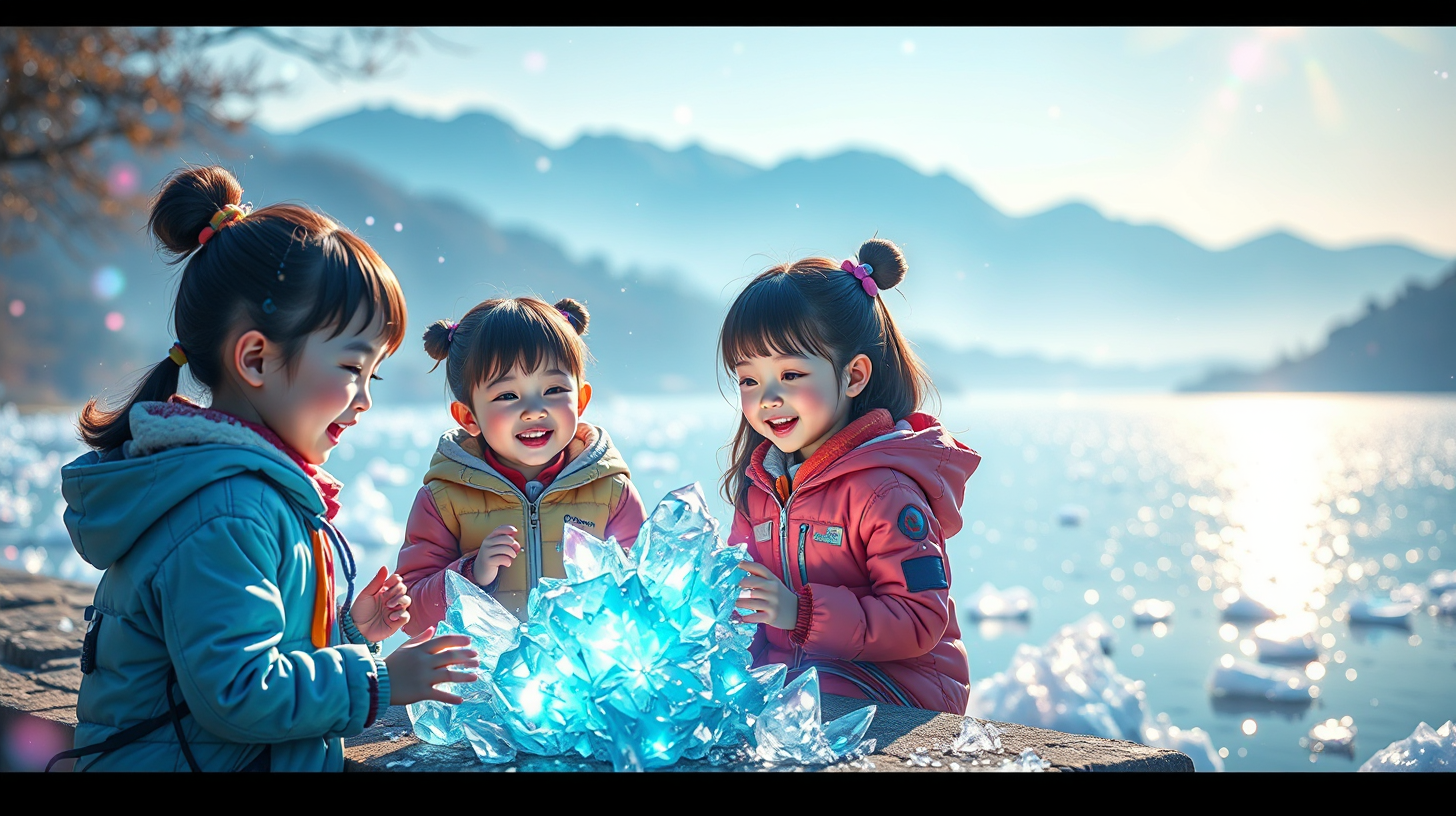 作图提示词:Children engaged with luminous ice crystals by the shimmering Jingyue Lake, their joyful faces reflecting curiosity and wonder, captured from a side view that accentuates sparkling light effects, surrounded by a lively atmosphere enriched with bright, vivid colors and soft ambient light, embodying the enchanting fusion of nature and futuristic technology.