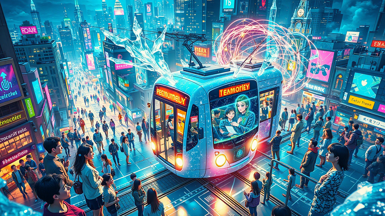 作图提示词:A vibrant futuristic cityscape with citizens interacting with a glowing tram that symbolizes the fusion of technology and memories, highlighted by quantum ice crystals illuminating the urban blueprint. An aerial view captures bustling city lights, with expressions of hope and unity on people’s faces, as dynamic light patterns swirl around the tram. The composition emphasizes bright, lively colors portraying a society where technology enhances human connections.