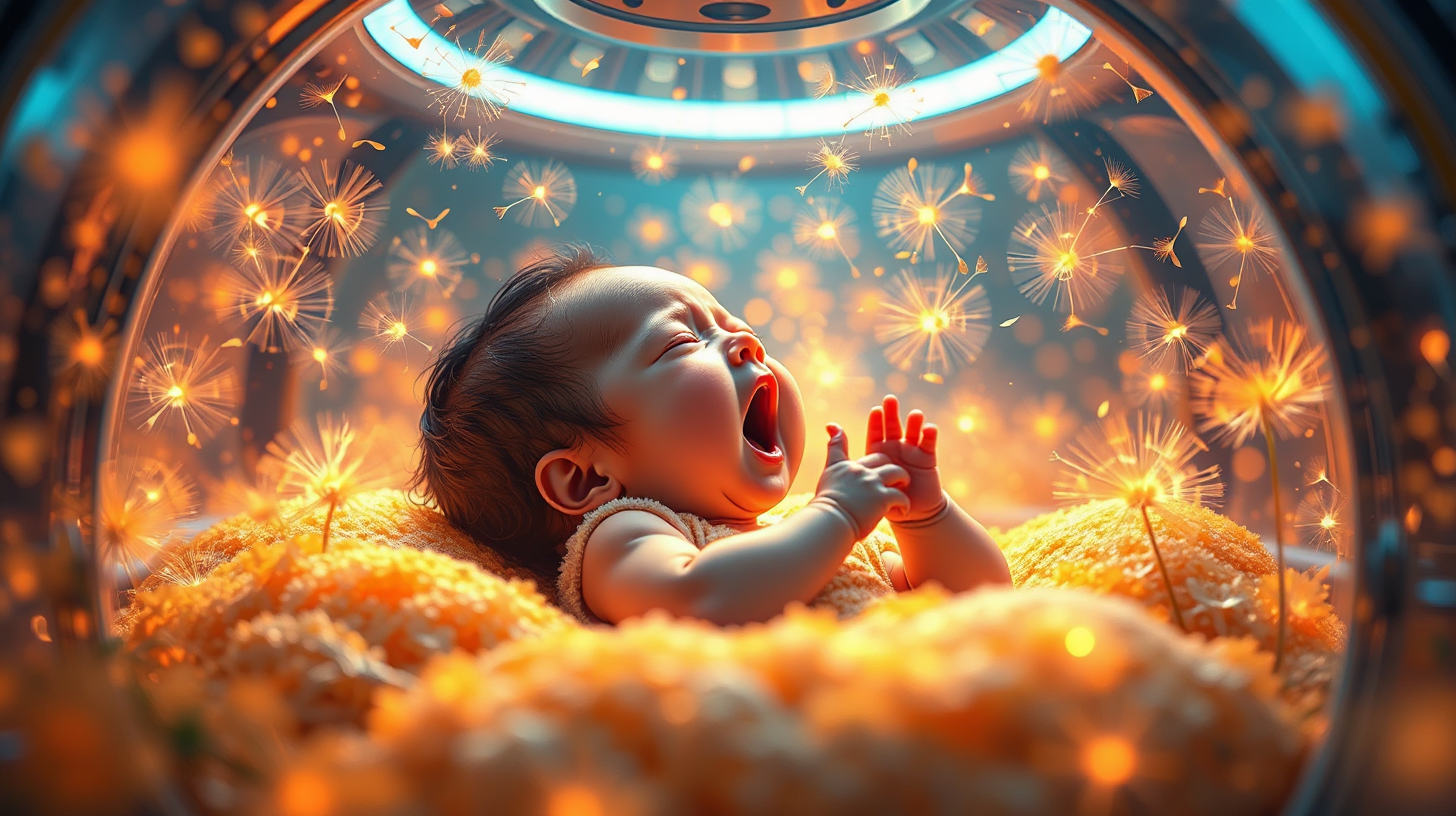 作图提示词:Inside a futuristic thought incubator, capturing the profound moment of a newborn’s first cry as ethereal light patterns drift gently like dandelion seeds, symbolizing hope and new beginnings. A close-up perspective showcases the intricate, warm colors of the blossoming light patterns around the infant, creating an atmosphere filled with vibrancy, life, and endless creative possibilities.