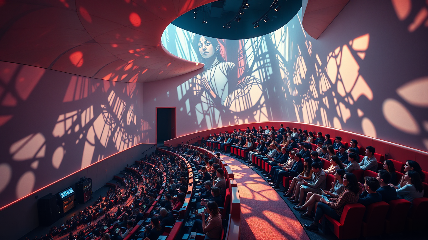 作图提示词:An avant-garde cinema with dynamic light and shadow play on the walls, an enthralled audience immersed in a high-tech film experience, showcasing dynamic architectural features that breathe life into the space, captured from a bird’s-eye view that highlights warm muted colors and an inviting, nostalgic yet innovative mood.