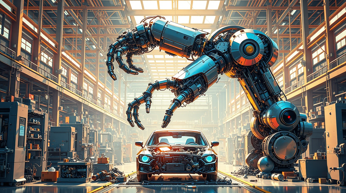 作图提示词:A colossal robotic arm gracefully assembling recycled components in a cutting-edge car manufacturing facility, with harmonious music playing in the background, highlighting intricate mechanical details, captured in a front view that accentuates the dramatic interplay of light and shadow against a backdrop of vibrant metallic colors, conveying an energetic and optimistic mood.