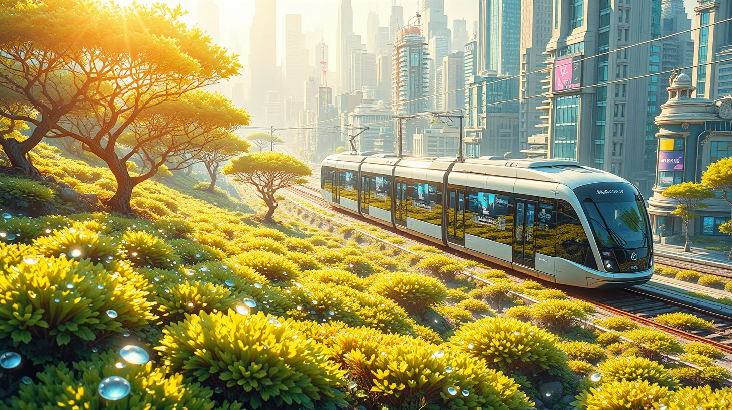 描述:晨光轻柔地洒落在轨道电车上,一旁的量子苔藓在阳光的抚摸下闪烁着晶莹的光芒,仿佛无数颗微小的星辰点缀其间。 sleek 的未来感电车在这光影交织的世界里缓缓滑行,车身映照着周围的景致,与生长的苔藓共同勾勒出一幅自然与科技完美融合的美妙画面。阳光透过苔藓的间隙,在地面上投下斑驳的光点,似在谱写一曲晨光中的赞歌,整个场景宁静而又充满生机,让人感受到希望在晨光中悄然绽放。