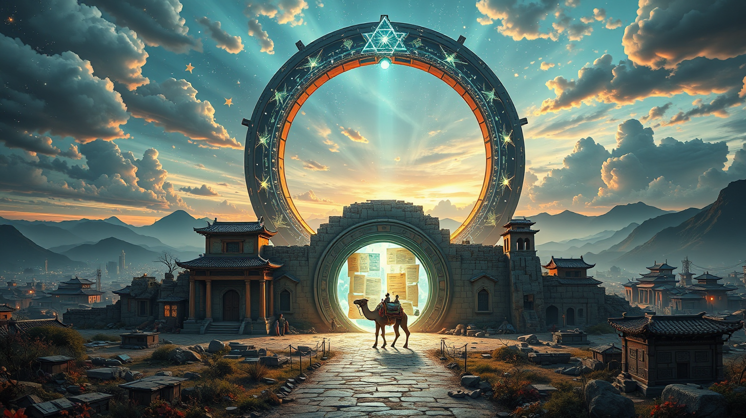 作图提示词:A sweeping panoramic view of Weiyang District, showcasing a futuristic star-ring particle collider looming over the historic Silk Road ruins, where a Tang dynasty-inspired drone, resembling a camel, emerges from a luminous portal, carrying ancient scrolls. This scene radiates grandeur and mystery, enhanced by dynamic lighting that captures the thrill of discovery within this unique blend of history and advanced science.