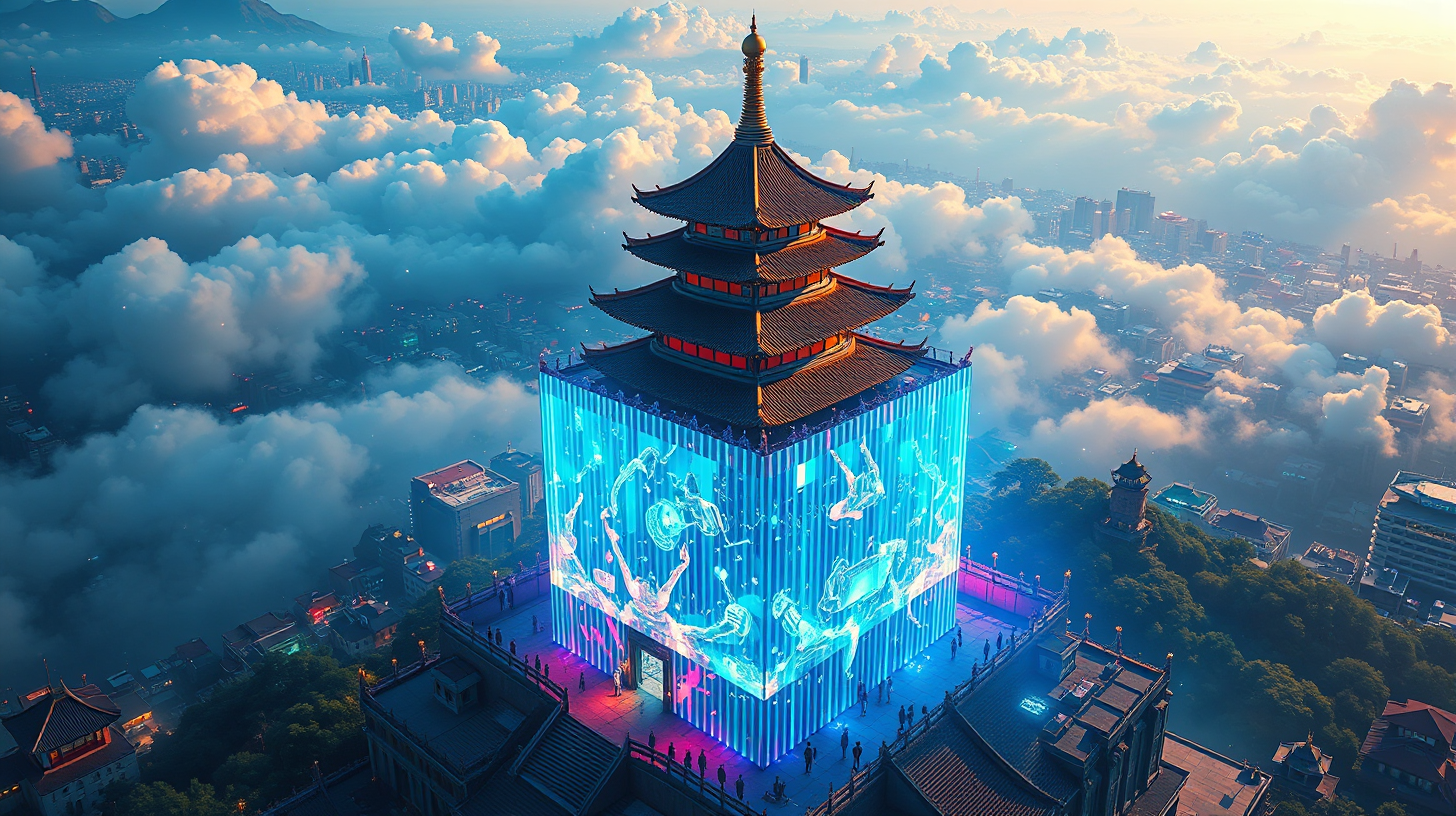 描述:大雁塔之巅,十二层环形光幕在空气中缓缓展开,如同一座连接天地的桥梁。纳米机器人在光幕中忙碌地穿梭,将出土文物的数据上传至云端。突然,时空泛起涟漪,全息投影在天空中浮现,古老的丝绸之路商队与未来的星际货船在同一画面中并行,驼铃声与科技的嗡鸣交织在一起。大雁塔的古老身影与光幕的现代光芒相互映衬,展现出一种跨越时空的壮丽与神秘。