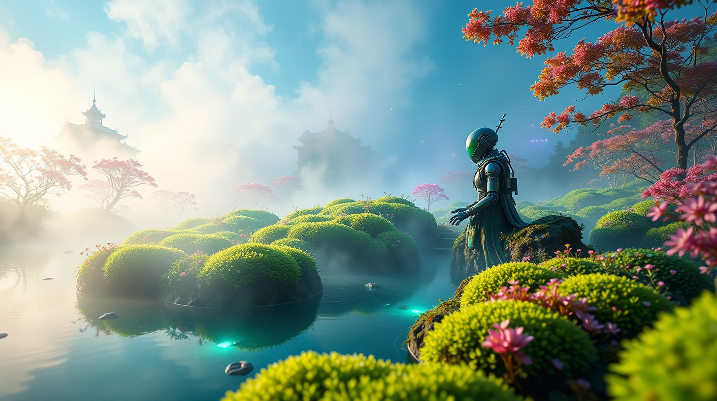 作图提示词:A low-angle view of Qujiang Pool, where bioluminescent bio-engineered moss elegantly shapes ancient Tang poetry characters, and an advanced robotic gardener crafts the landscape using precision laser tendrils. The scene encapsulates a dreamy harmony between technology and nature, drenched in vibrant colors and ethereal lighting, with a soft mist enhancing the serene atmosphere that evokes a sense of rebirth and poetic beauty.
