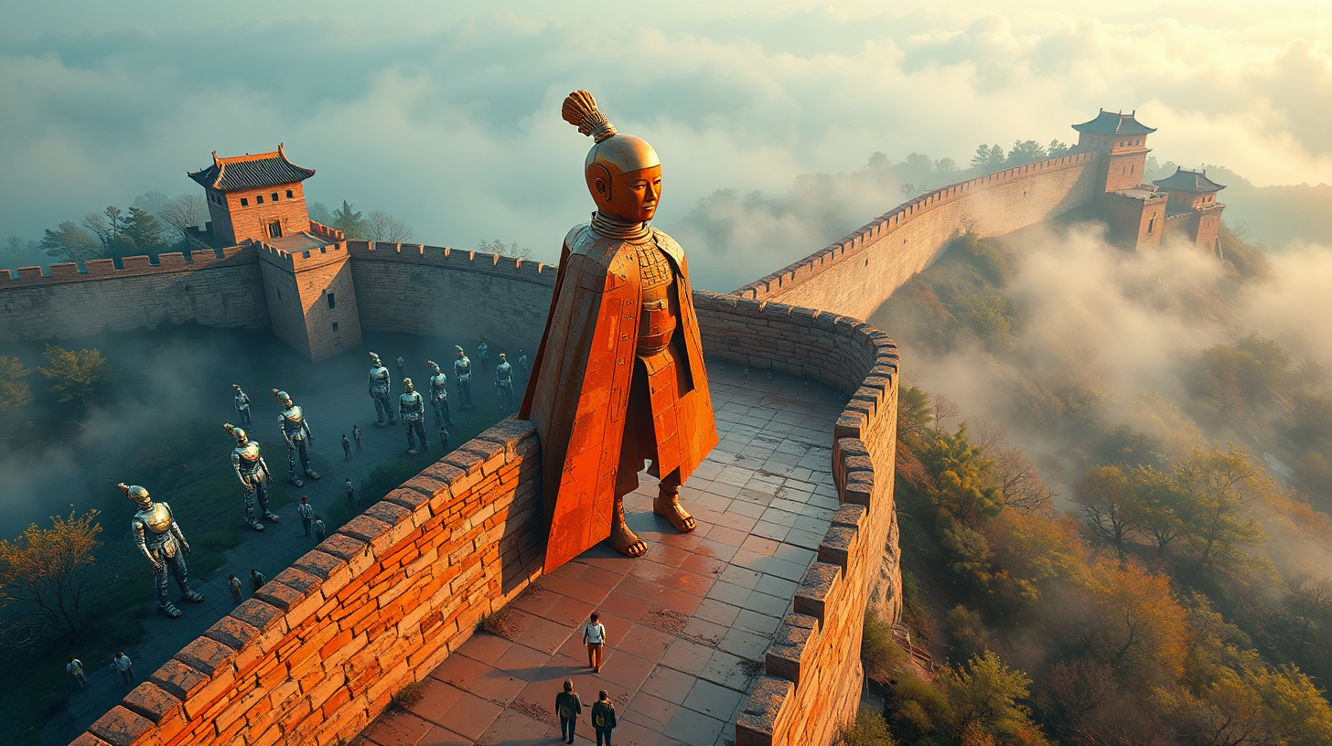 描述:晨雾如轻纱般笼罩着古城墙,纳米修复机器人在墙下有序聚集,渐渐形成一尊巨型的兵马俑。它们的表面闪烁着青铜色的液态金属光泽,在晨光的映照下,宛如古老的战士被赋予了新的生命。金属流动间,偶尔迸发出耀眼的光辉,仿佛在向历史致敬。整个场景神秘而宏伟,晨雾中的光影变幻,让古老与现代的交融更加震撼人心。