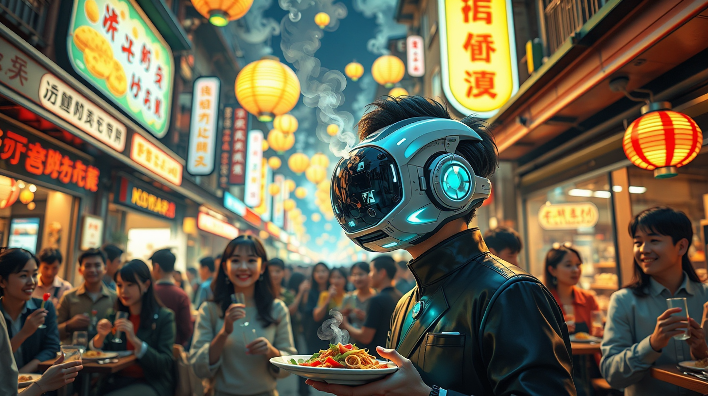 作图提示词:A close-up view of the bustling Huimin Street, where glowing aroma projections of authentic local delicacies mingle in the air. An innovative architect adjusts a futuristic translation device, surrounded by eager diners radiating anticipation and joy. Captured at eye level, the vibrant colors artfully highlight the synergy between cherished culinary traditions and contemporary technological advancements.