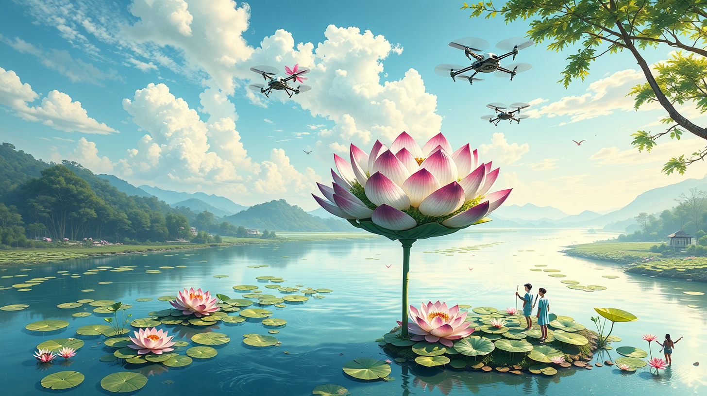 作图提示词:Above the serene waters of the Gan River, a lotus-inspired ecological simulator glides effortlessly, while innovative moisture-regulating devices thrive along the banks—students’ climate drones traverse the sky, enhancing the vivid harmony of technology and nature.
