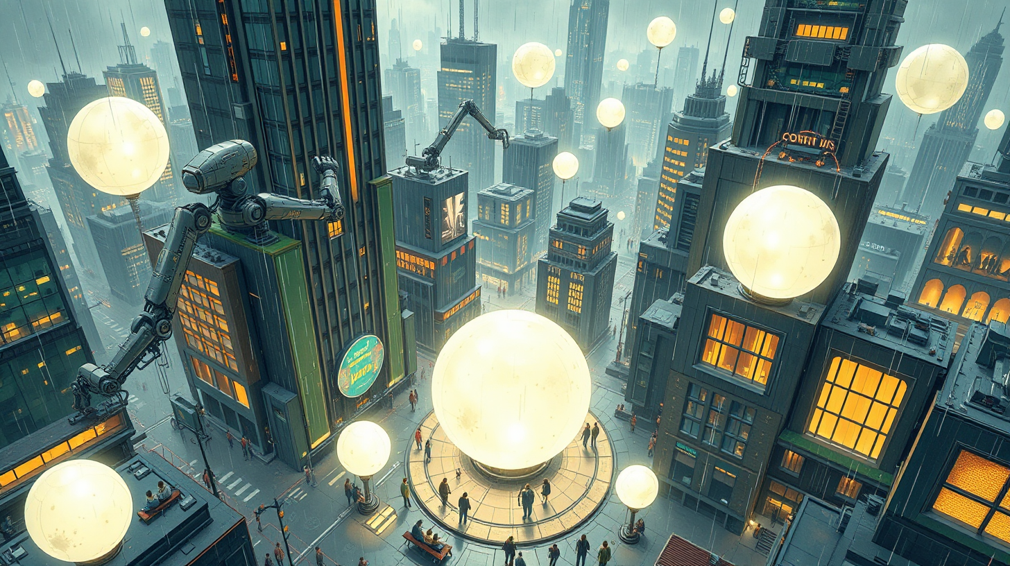 作图提示词:An aerial view of a futuristic city during a rainstorm, where smart benches are connected to a central AI hub. Mechanical arms extend from skyscrapers to assist stranded citizens, while illuminated windows radiate a warm glow. Spheres of calming light float around, creating a comforting aura for anxious residents, encapsulating safety in the storm.