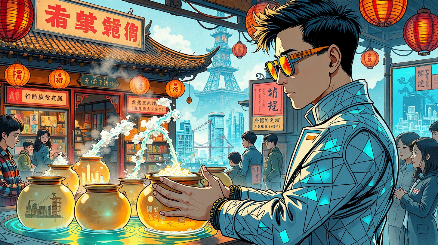 作图提示词:A close-up of a traditional shop near Shengjin Tower, transformed with futuristic elements. The shopkeeper, wearing smart glasses and a crisp, futuristic jacket with geometric patterns, pours glowing data into a luminous river, with each pot shining in vibrant hues. City construction blueprints flow from the water, symbolizing wisdom and hope, while customers observe with curiosity.