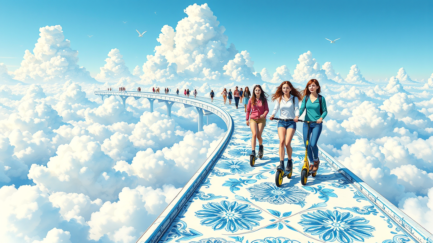 作图提示词:A beautifully designed blue-and-white porcelain-patterned walkway stretches above the clouds, as commuters glide smoothly with anti-gravity pedals, engaging in a playful interaction with the pathway that creatively shifts into an intricate design, showcasing their amazed and adventurous expressions.