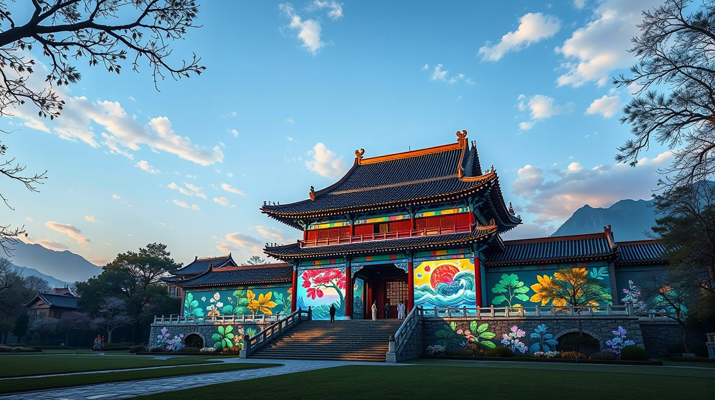 作图提示词:In the morning light, the majestic Tengwang Pavilion is beautifully illuminated by advanced holographic projections of its historical poetry, seamlessly blending vibrant colors with the ancient architecture.