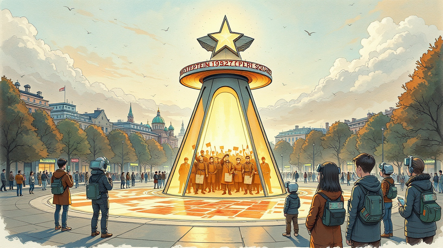 作图提示词:At the October 1st Uprising Square, a beacon-like star observation platform emits a soft glow. Citizens, equipped with futuristic communication devices, gaze down with solemn respect, watching a holographic representation of the 1927 uprising displayed below.