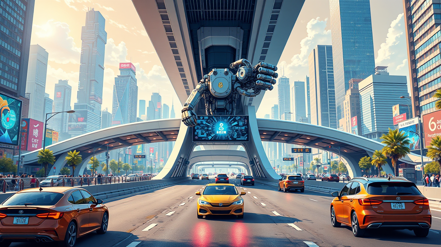作图提示词:An impressive 8D interchange in a bustling cityscape, where a sophisticated mechanical arm emerges from a sleek barrier, providing holographic displays that engage and soothe drivers waiting in traffic. The scene highlights the futuristic architecture of the interchange, rich in intricate details reflecting the synergy between advanced technology and human experience. Captured from a front view in close-up perspective, with vibrant colors that illustrate the harmonious interplay of innovation and empathy.