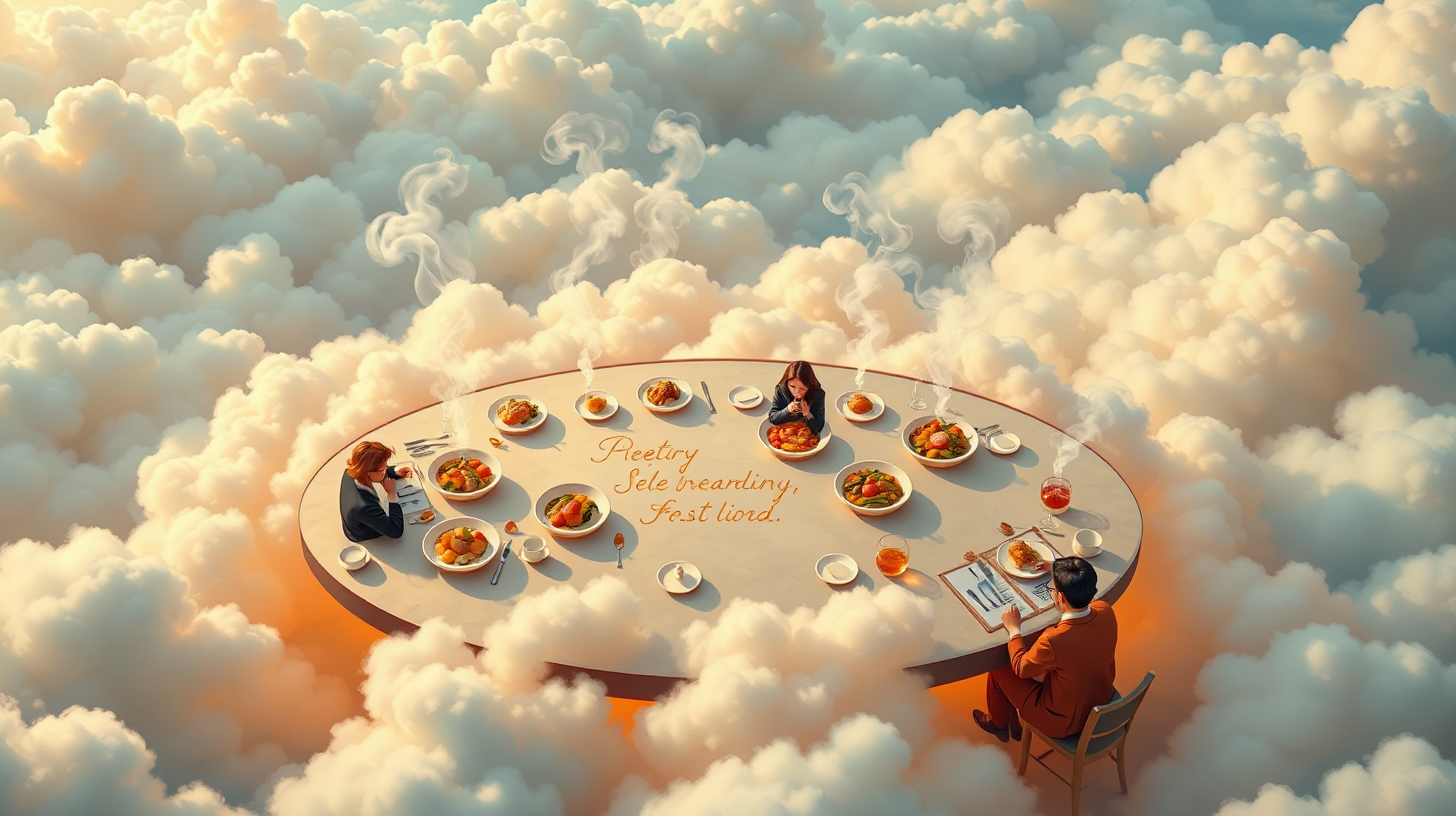 作图提示词:A mesmerizing floating dining platform surrounded by soft, fluffy clouds, where steam rises from beautifully arranged dishes, revealing poetic phrases written in edible gold leaf. Diners savor the aromas while enjoying a breathtaking sensory experience. An overhead view, with warm, inviting colors that enhance the luxurious ambience.