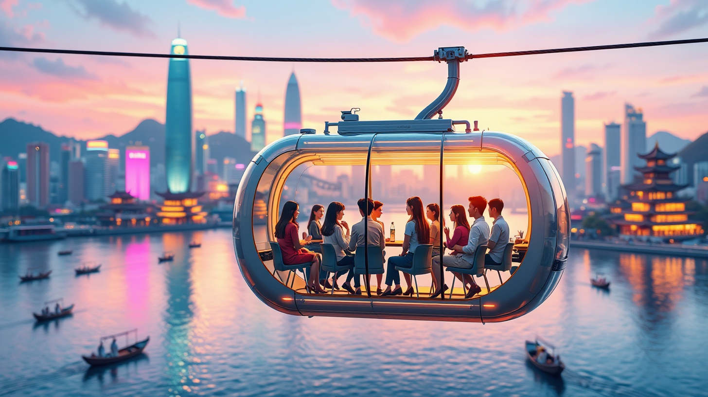 作图提示词:A transparent cable car gliding through a futuristic skyline of Chongqing, showcasing the ancient Bayu Wharf with traditional boats harmoniously blending with advanced quantum technology. Inside the car, enthusiastic students engage in lively discussions about the fusion of history and technology, set against a backdrop of vibrant colors and dynamic lighting that accentuates the connectivity of the past and a high-tech future. Shot from a side view with an aerial perspective, capturing the vivid atmosphere.