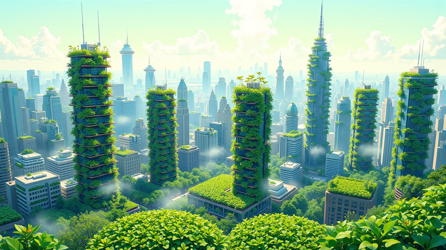 作图提示词:An expansive cityscape featuring skyscrapers adorned with lush vertical gardens, where gentle mist nourishes thriving crops below. The scene captures a harmonious relationship between advanced technology and nature, highlighting the beauty of ecological innovation. A bird’s-eye view, with vibrant greens and serene colors to evoke a peaceful yet progressive atmosphere.