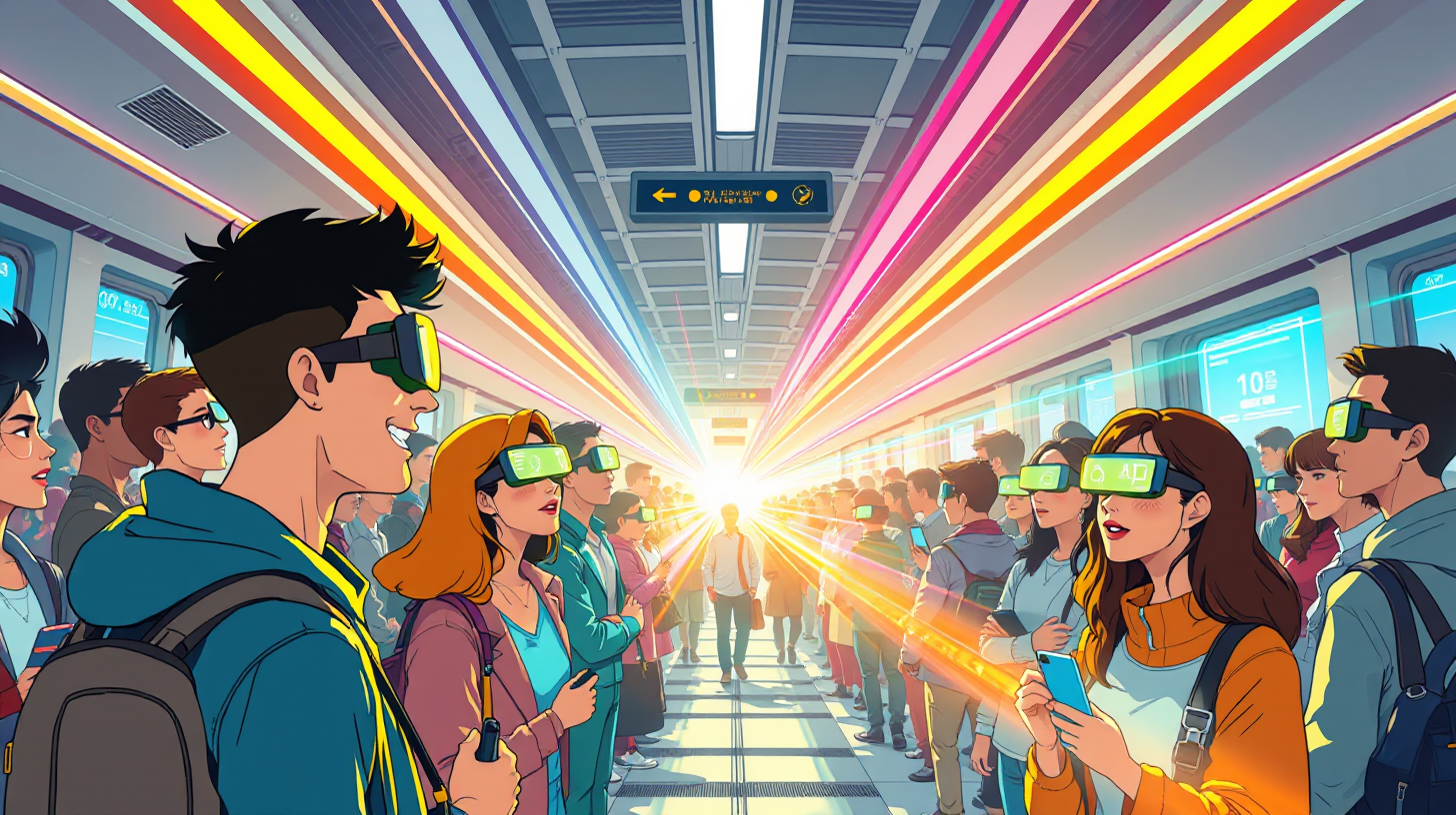 作图提示词:A bustling light-rail station filled with commuters engaged in dynamic conversations enhanced by augmented reality interfaces. Faces radiate excitement as vibrant pathways of light weave through the crowd, encapsulating the energy of a futuristic urban life. A front view, with brilliant colors creating an electrifying environment.