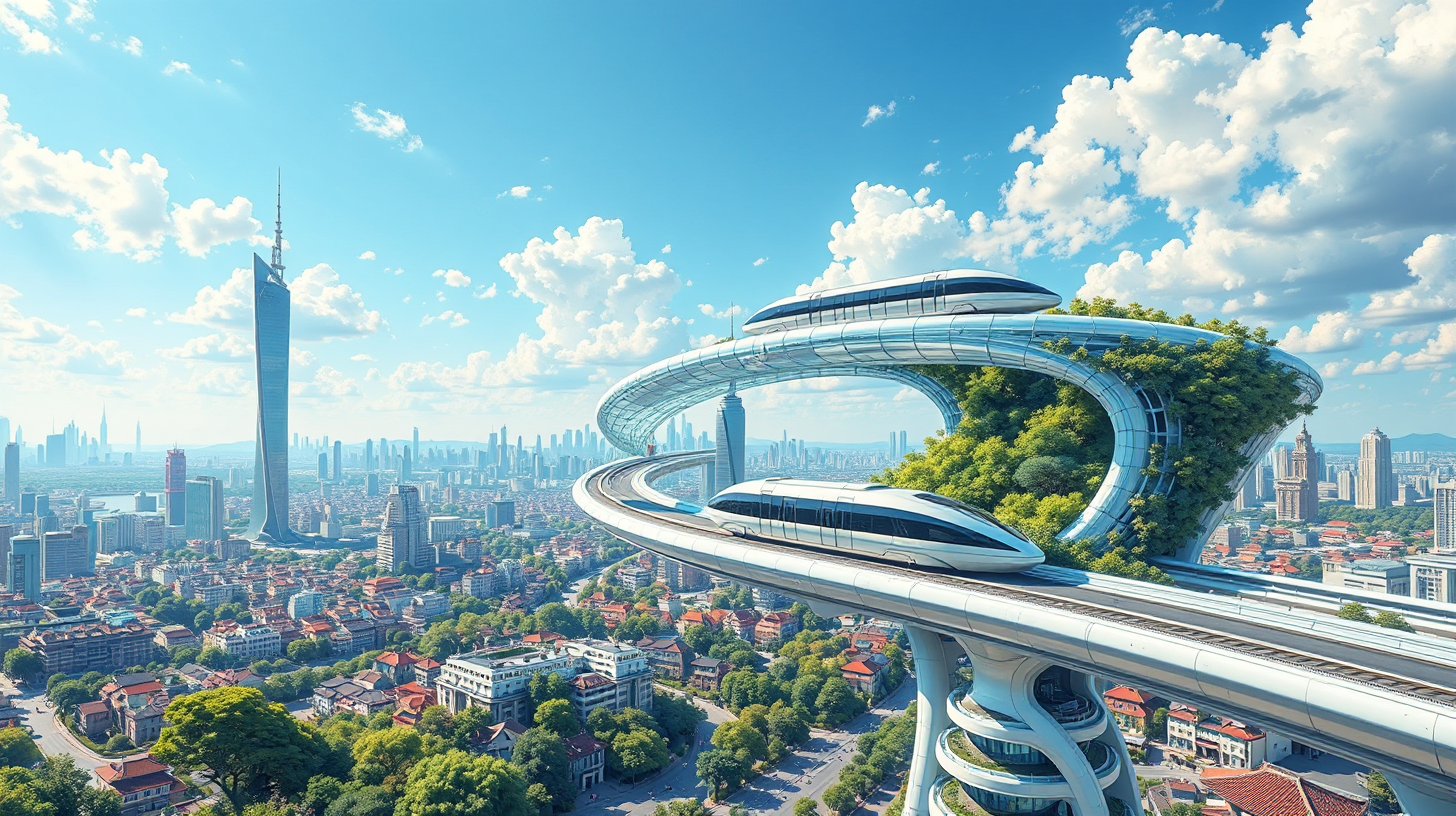 作图提示词:A futuristic cityscape of Zhuzhou, China, showcasing a transparent spiral rail system overhead, with a sleek magnetic levitation train gliding through. The vibrant architecture of the city is harmoniously interwoven with lush greenery under a bright blue sky, creating a stunning juxtaposition of technology and nature. An aerial view emphasizes the city’s artistic design, highlighting the seamless connection between its rich history and vibrant future.
