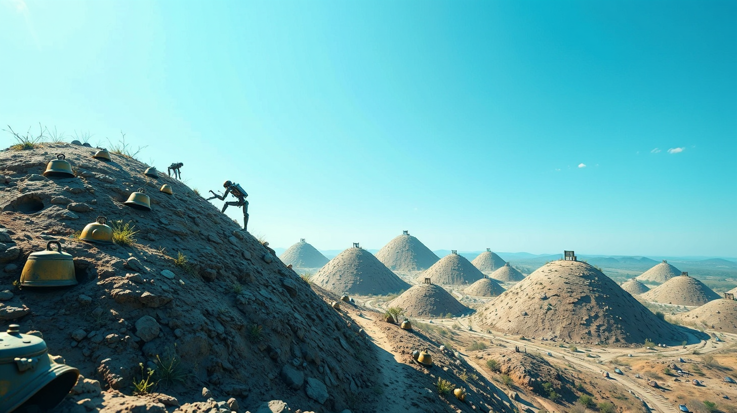 作图提示词:A distant aerial view above the ancient burial mounds of Luyuan, where cutting-edge nanobots are delicately extracting bronze bells from the earth. The clear blue sky above mirrors the contrasts of ancient artifacts, creating a beautiful composition that blends historical significance with technological advancement seamlessly. This tilted perspective captures the rhythmic interplay between tradition and modernity.
