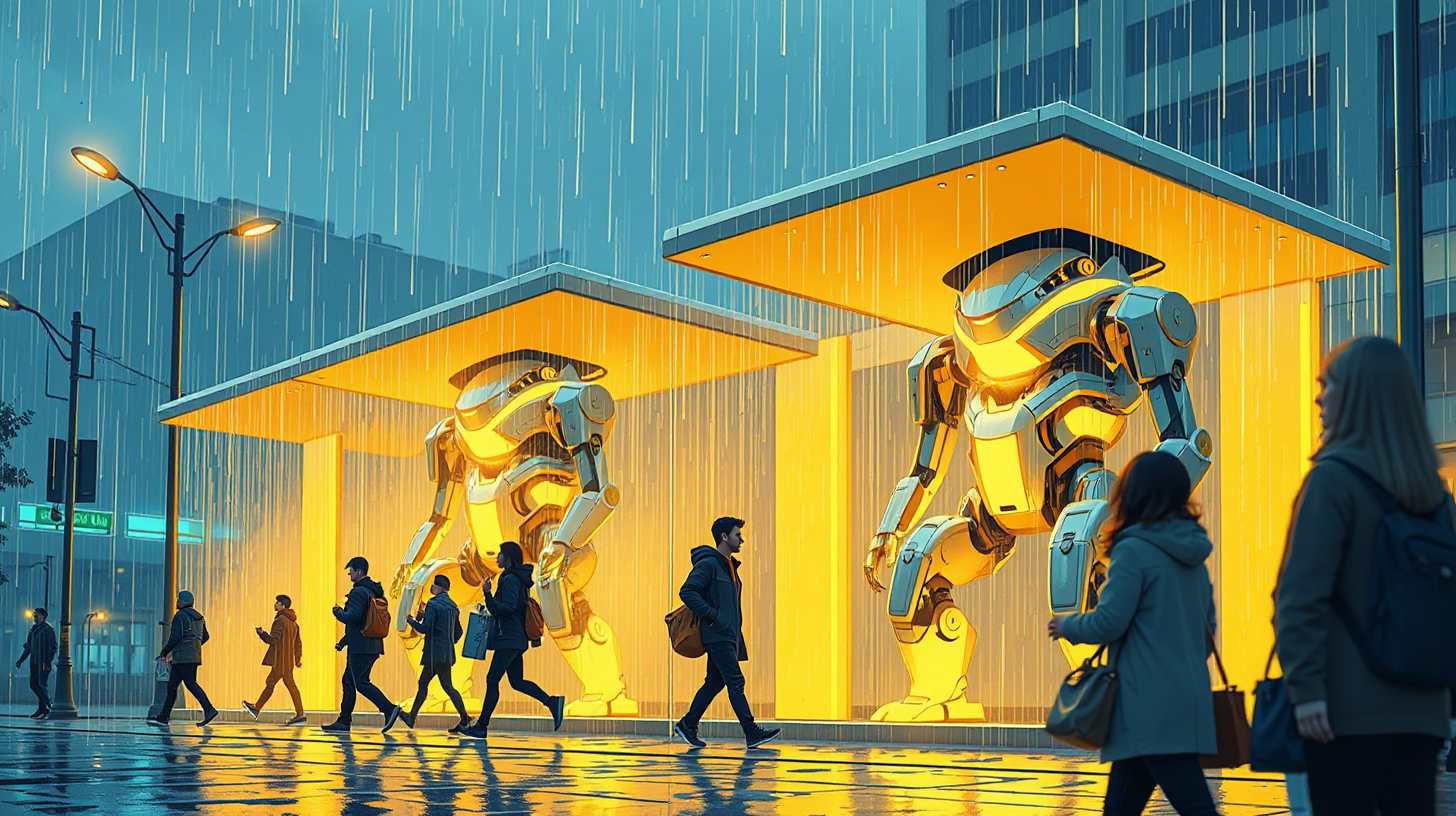 作图提示词:Capture a side view of mecha transforming from streetlights into protective guardians amid a downpour. The mechs, crafted from sleek titanium alloy, glow warmly, creating a safety barrier around hurried pedestrians, who express relief and safety. The dynamic lighting and sleek designs contribute to the comforting ambience.
