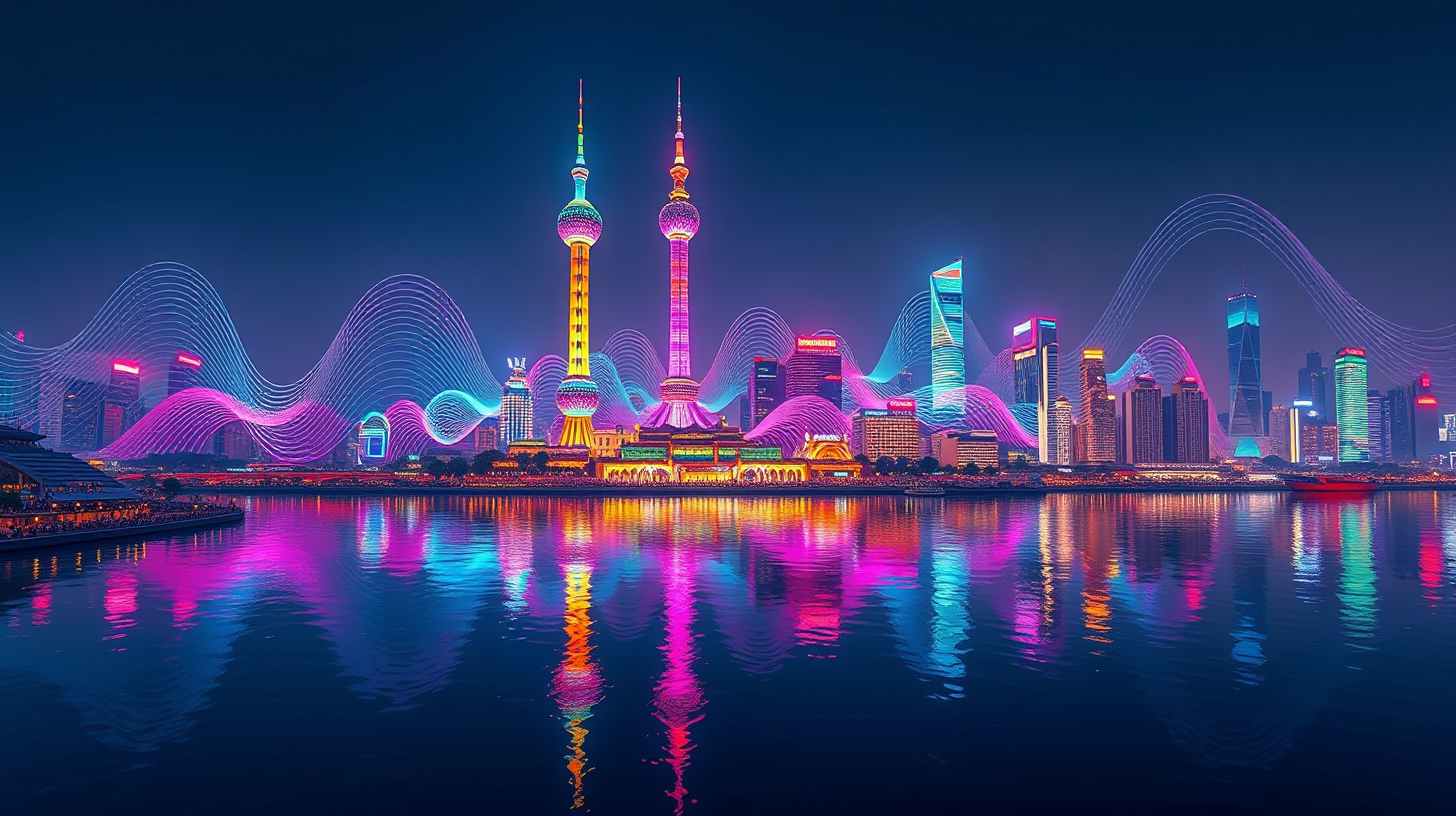 描述:夜幕下的东方明珠化身为雄伟的神经脉冲发射塔,塔身的环状结构随着市民的集体情绪轻轻涨落伸缩。深夜,情感算法架构师们启动全域脑波共鸣,刹那间,黄浦江上浮现出一群跃动的治愈光鲸群,它们由焦虑数据流转化而来,在江面上下游嬉戏,周身散发着柔和的光芒,与东方明珠的璀璨灯光相互映衬,奏响一曲震撼心灵的脑波交响曲。