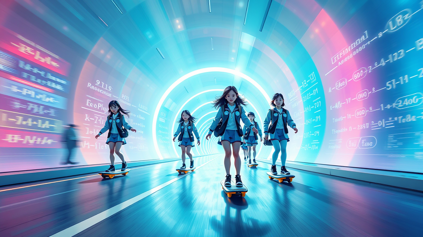 作图提示词:A vibrant street in the future Shanghai’s Zhangjiang Science City, where dynamic high school students glide effortlessly on anti-gravity skateboards through a luminous quantum tunnel. Their stylish uniforms feature gently shimmering badges, creating a striking contrast against the tunnel’s glow. The scene is enriched with holographic displays showcasing past research equations, captured from a low eye-level perspective to enhance the sense of speed and adventure, enveloped by an array of vibrant colors.